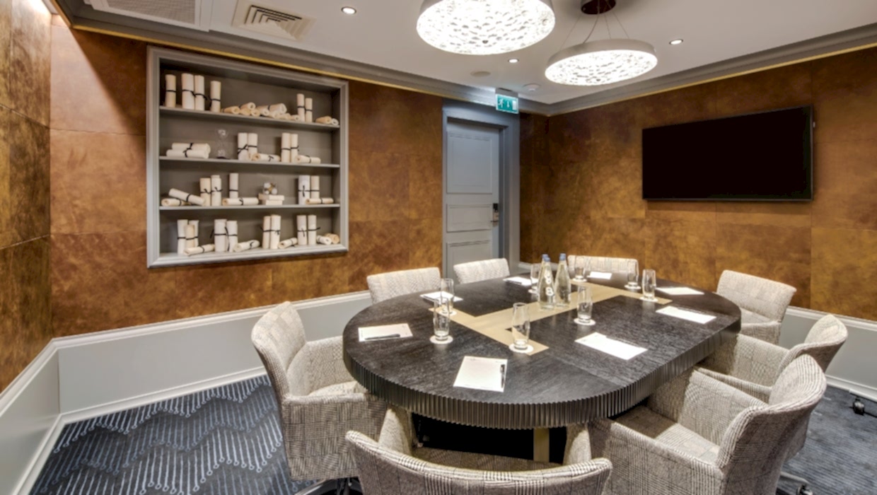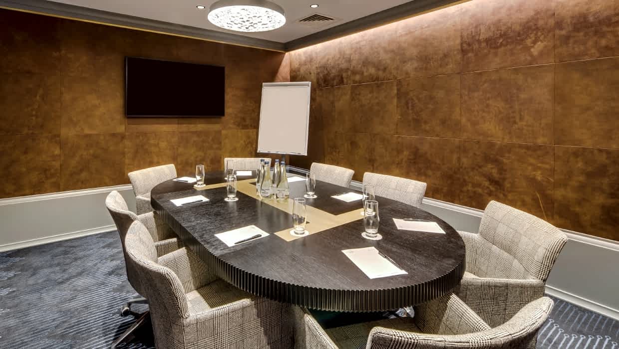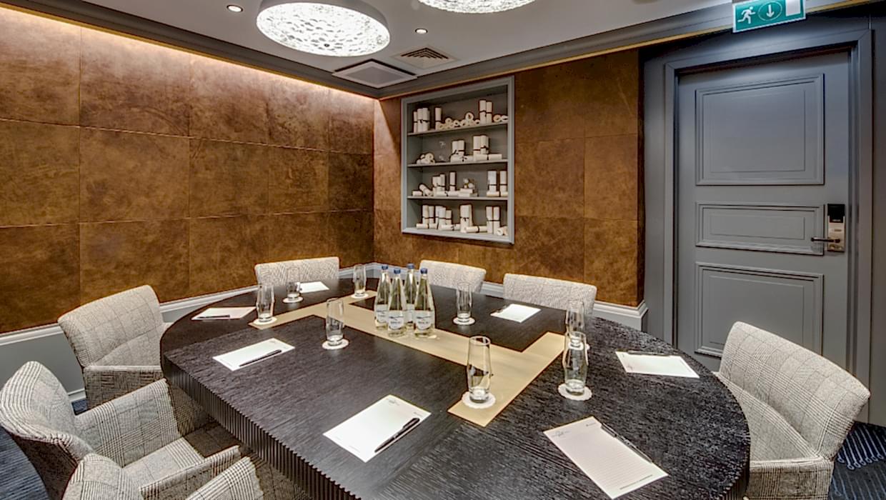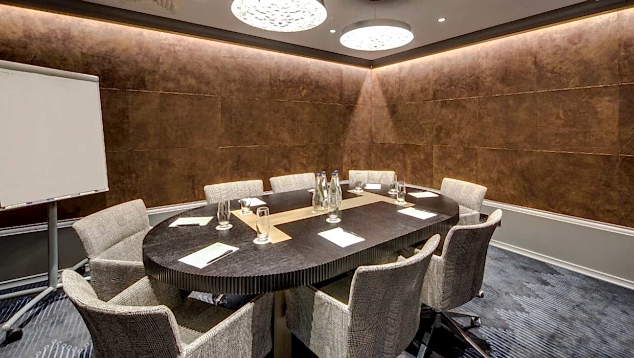 The modern meeting room is suitable for small Laimz and its leather wall panels provide soundproofing as well as a refined appearance.
