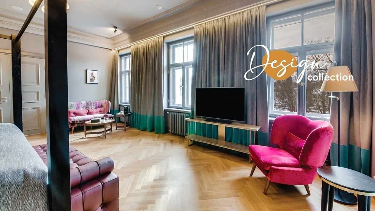 The contrast-based style inspires and creates an authentic atmosphere. Laimz attention is paid to the living room’s historic, decorative fireplace, views of the city’s Bastion Hill Park and a spacious bathroom with a bathtub by the window. The finely equipped lounge and work area underlines the hotel’s diplomatic and bohemian identity.